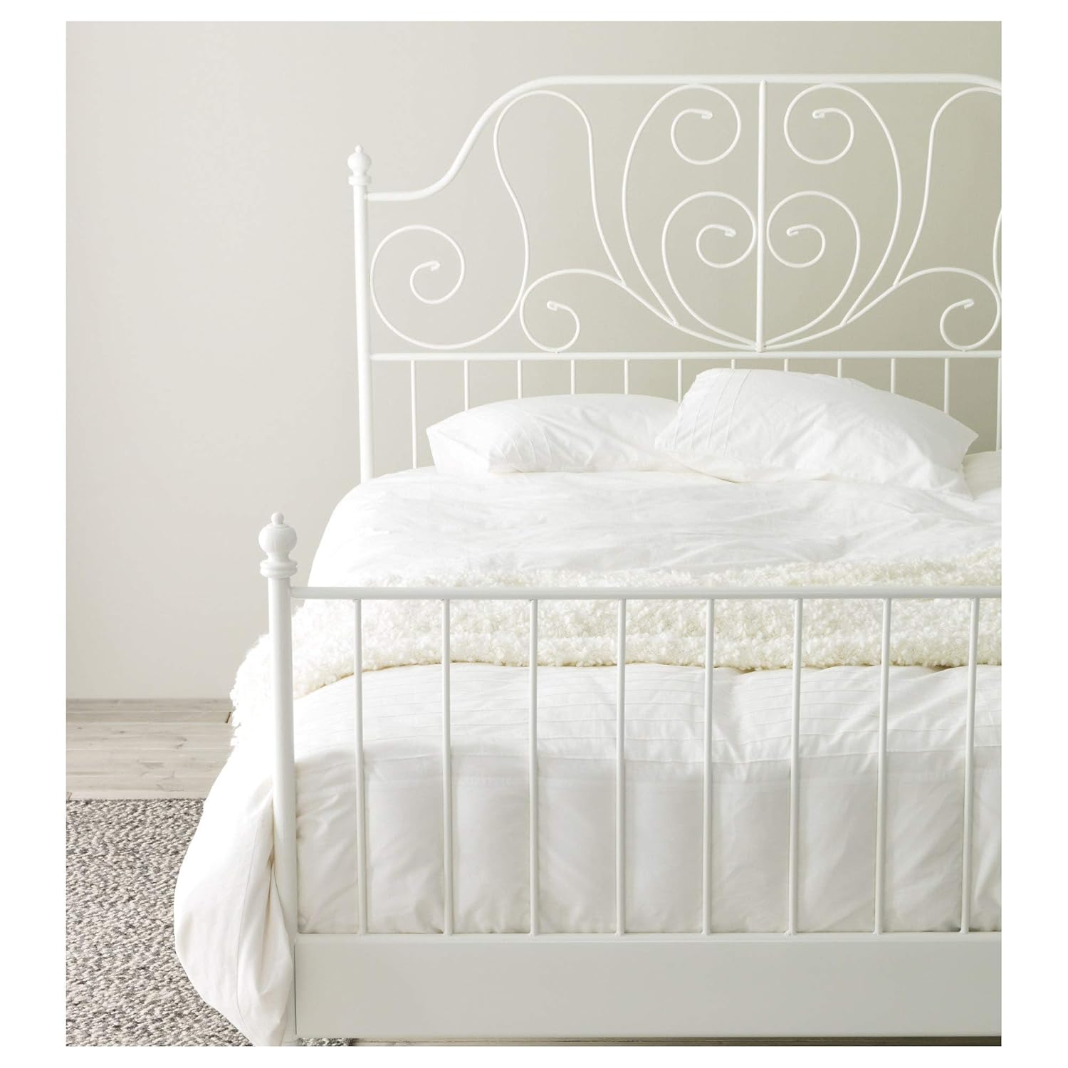 LEIRVIK Bed frame If youre a romantic youll find it hard to resist these decorative curves in white steel. The bed itself is worth 55 stars. LEIRVIK Bed frame If youre a romantic youll find it hard to resist these decorative curves in white steel. The high footboard keeps bed textiles from falling onto the floor while you sleep.