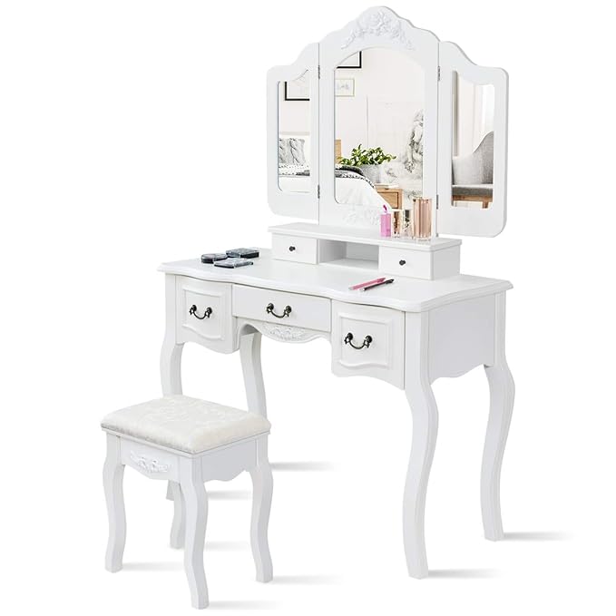 Goflame Vanity Table Set Vintage Dressing Table Set With Tri Fold Mirror And 5 Drawers Vanity Set With Soft Cushioned Stool Makeup Table With 2 In 1 Detachable Design White Amazon In Furniture