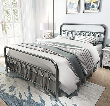 Yalaxon Vintage Sturdy Queen Size Metal Bed Frame With Headboard And Footboard Basic Bed Frame No Box Spring Needed Gray Silver Queen Gray Silver Amazon In Furniture
