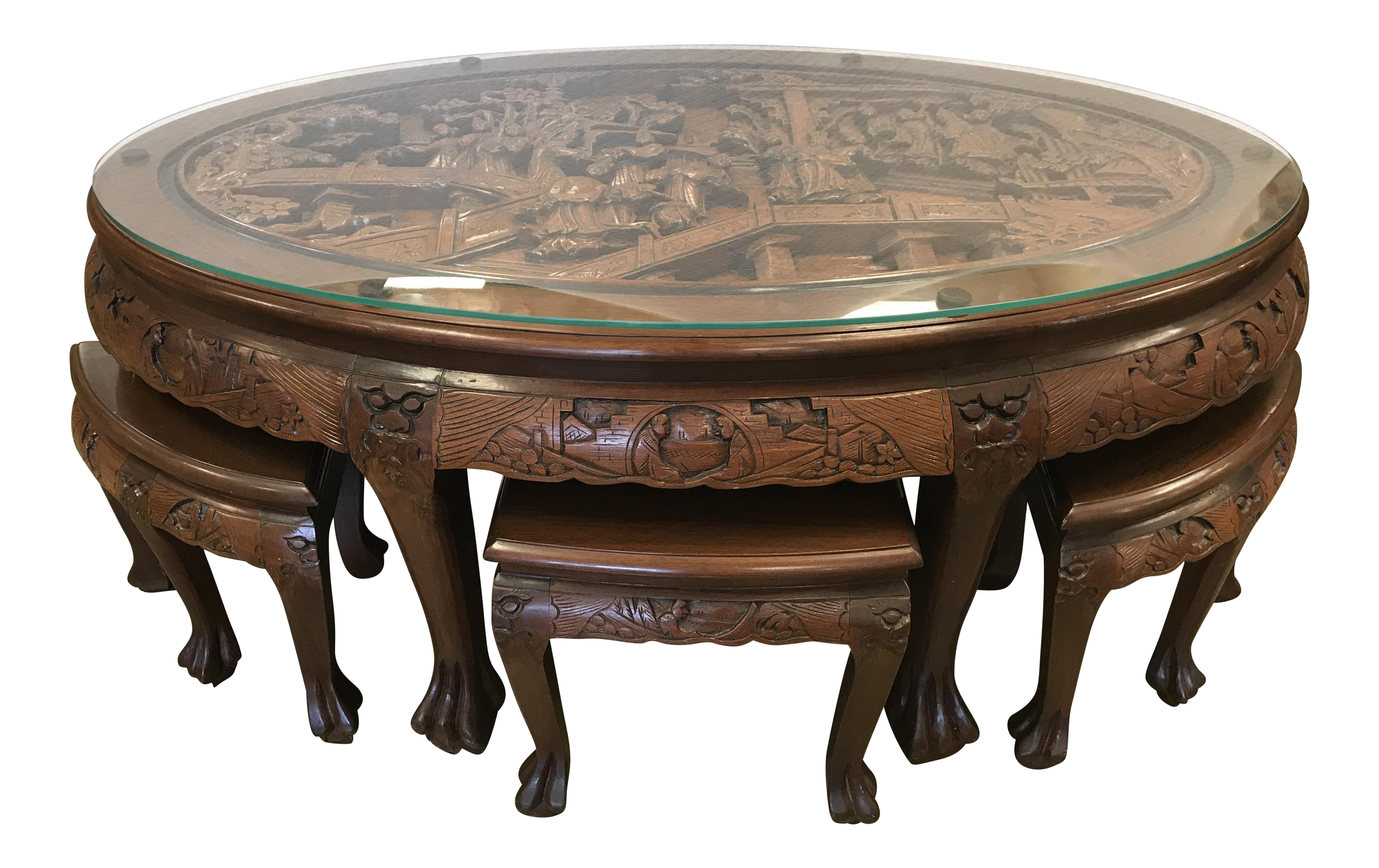 Oriental Carved Round Coffee Table With Stools Oriental Furnishings Furniture Decor