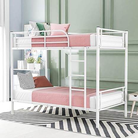 Twin Over Twin Metal Bunk Bed With Removable Ladder Heavy Duty Bed Frame With Safety Guard Rails For Kids Teens Adults White Amazon In Home Kitchen